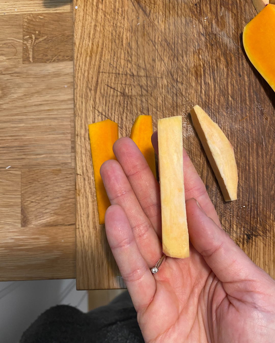 Descasque a batata e corte-a em tiras largas. Coza ou asse até estar macia e ofereça ao bebé. As batatas no forno encolhem, por isso pode cortar palitos um pouco mais largos.