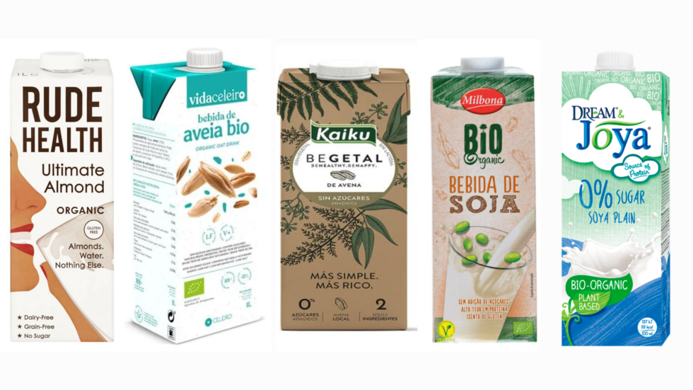 Da esquerda para a direita: Bebida de amêndoas da Rude Health (à venda no Continente e Go Natural), bebida de aveia da Vida Celeiro (à venda no Celeiro), bebida de aveia da Kaiku (à venda no Auchan), bebida de soja bio da Milbona (à venda no Lidl) e bebida de soja da Dream & Joya. Estas bebidas são feitas apenas com água e outro ingrediente (amêndoa, aveia ou soja). São as únicas opções no mercado atualmente (e que eu tenha conhecimento claro), que não contêm nenhum aditivo.
