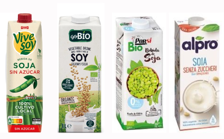 Da esquerda para a direita: Bebida de soja sem açúcar da Vive Soy, bebida de soja bio do Pingo Doce GoBio, bebida de soja Porsi Bio do Intermarché e bebida de soja sem açúcar da Alpro.