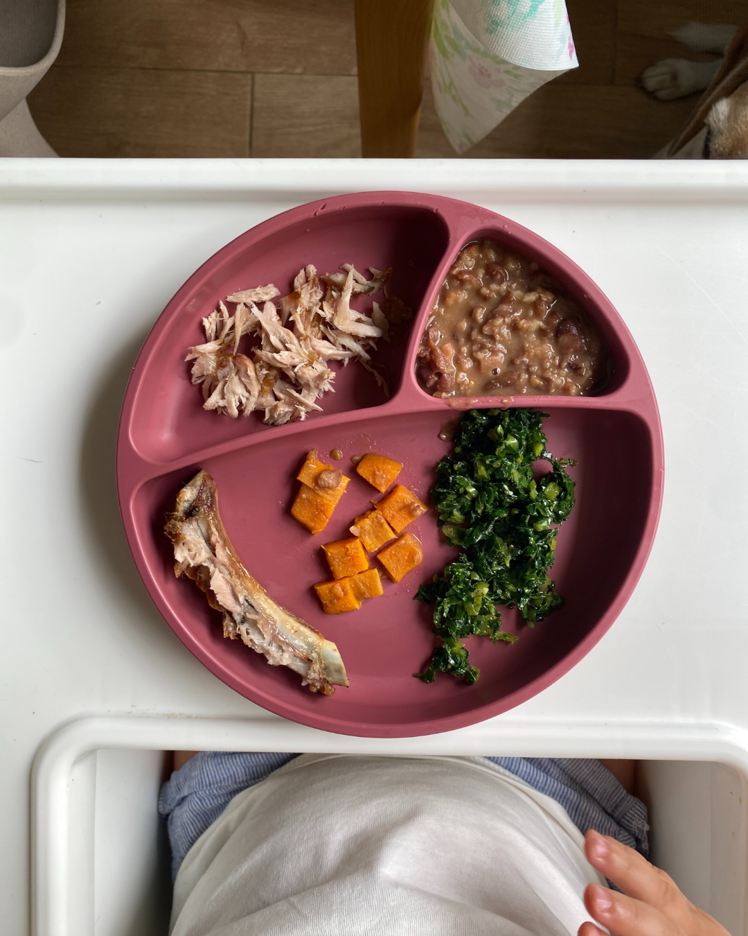Há várias opções para oferecer carne de porco nesta fase. A minha favorita é oferecer o osso do entrecosto para o bebé praticar a mastigação e fortalecer a mandíbula. Asse o entrecosto, retire a maior parte da carne e qualquer pedaço de cartilagem que se possa soltar, e teste sempre o osso para garantir que não se parte.