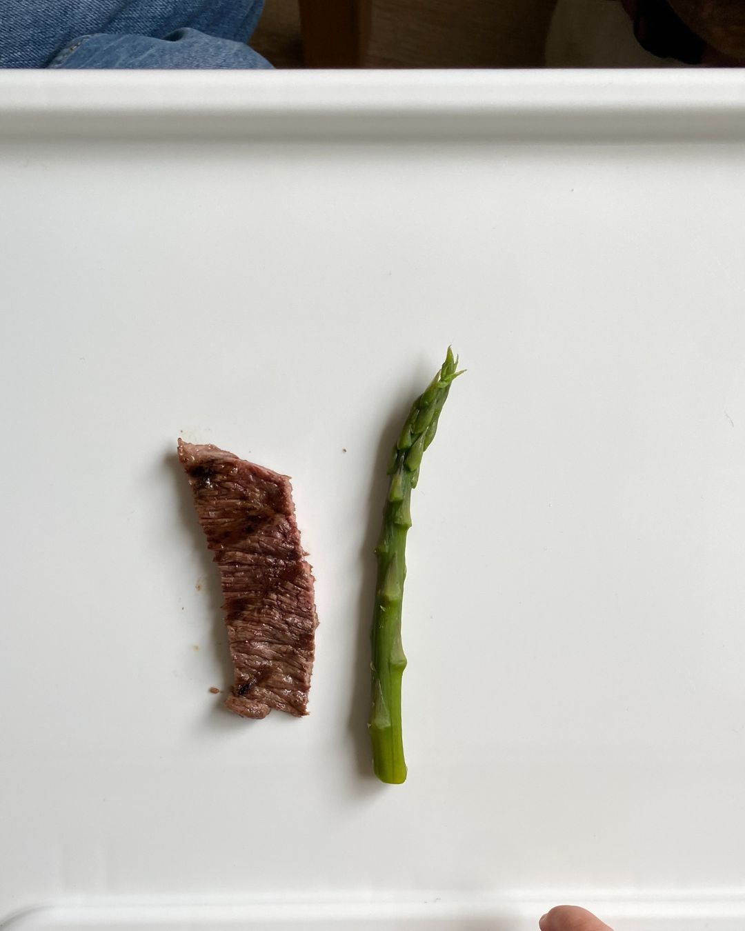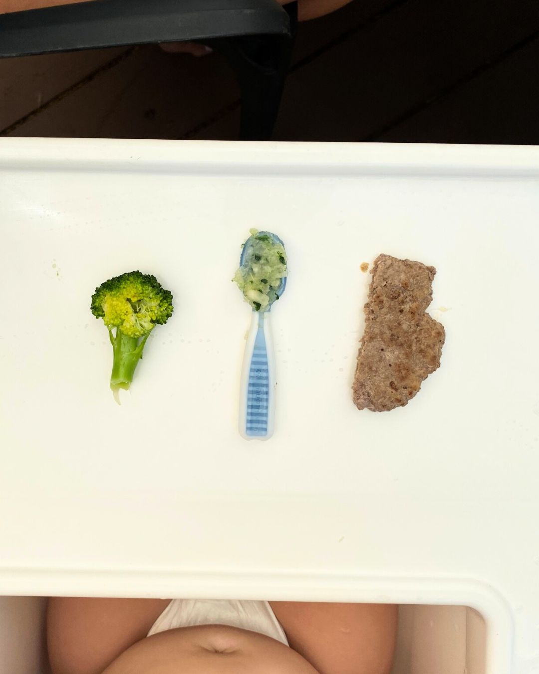 Se oferece hambúrguer, continue a pedir para picar a carne 3 vezes, e continue a oferecer o hambúrguer cortado ao meio, ou comece a oferecer pedaços menores.