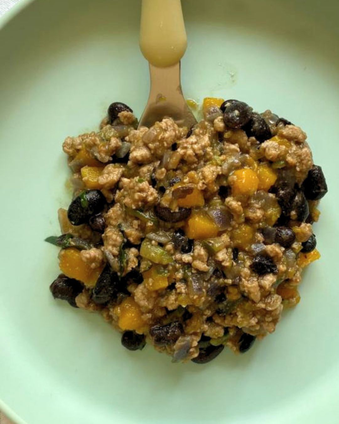 Pode também fazer um puré de batata ou de algum cereal (millet, quinoa), cozinhar a carne à parte, desfiar ou picar e misturar.
