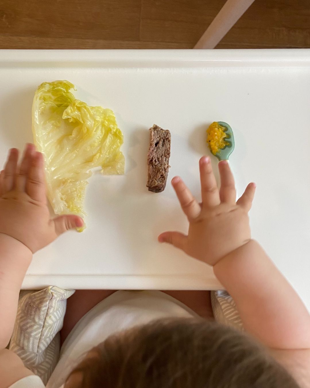 Outra opção muito semelhante ao hambúrguer são almôndegas ou rolo de carne. O rolo de carne só precisa ser cortado uma tira fina para o bebé (como na foto).