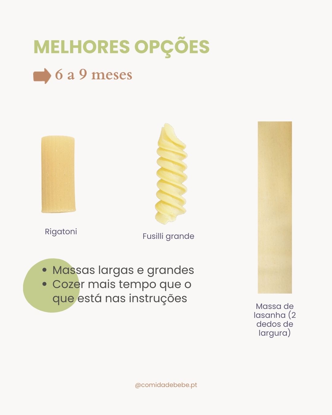 Numa fase inicial, escolha tipos de massa que sejam fáceis do bebé agarrar com a mão e levar à boca. Alguns exemplos: