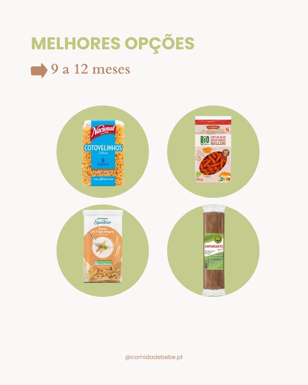 A partir dos 9-12 meses já deve estar a oferecer massa como oferece para o resto da família, com a exceção do esparguete que deve ser cortado em pedaços menores para o bebé.