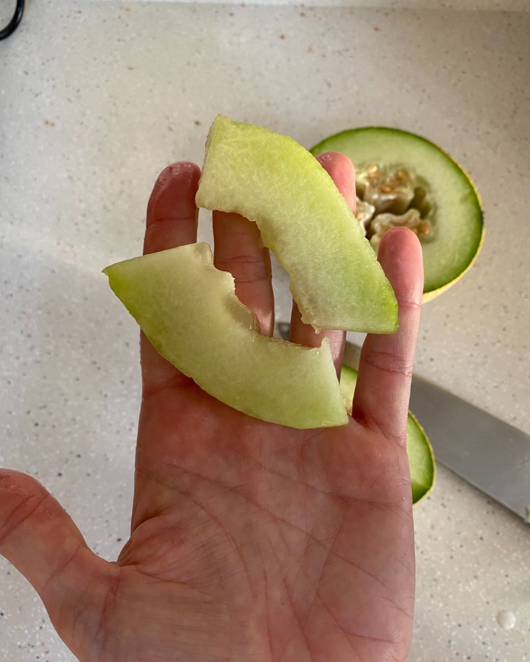 Lave bem a casca da meloa, retire a casca e as sementes. Corte em retângulos largos e finos ou meias luas, finas também. Lembre-se que o pedaço tem de ser comprido o suficiente para o bebé agarrar com a mão e ainda sobrar um pedaço da fruta par ao bebé conseguir levar à boca. Mantenha o mesmo corte até aos 12 meses.