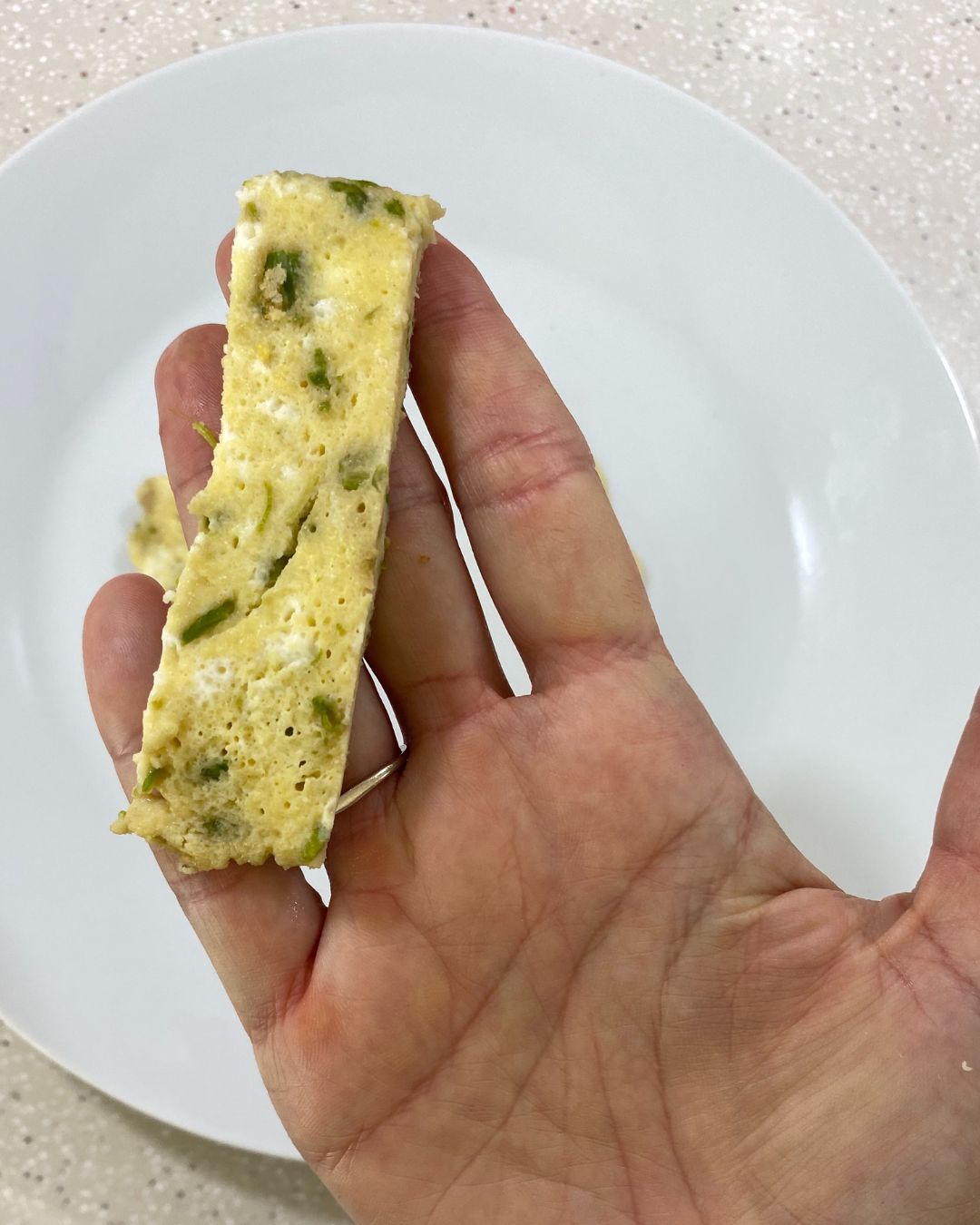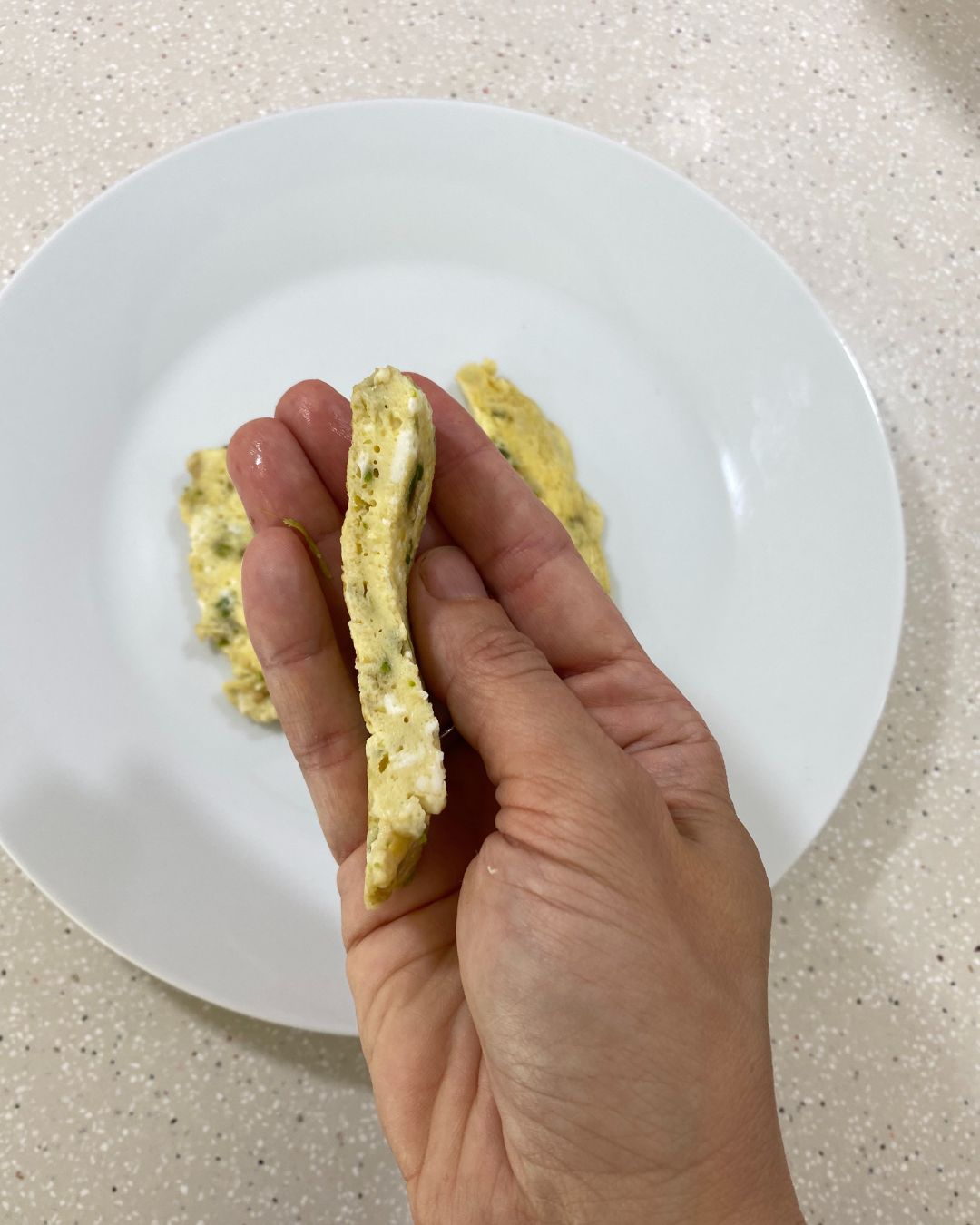 Pode continuar a oferecer omelete, mas nesta fase pode reduzir o tamanho e oferecer em pedaços para o bebé agarrar com a ponta dos dedos.