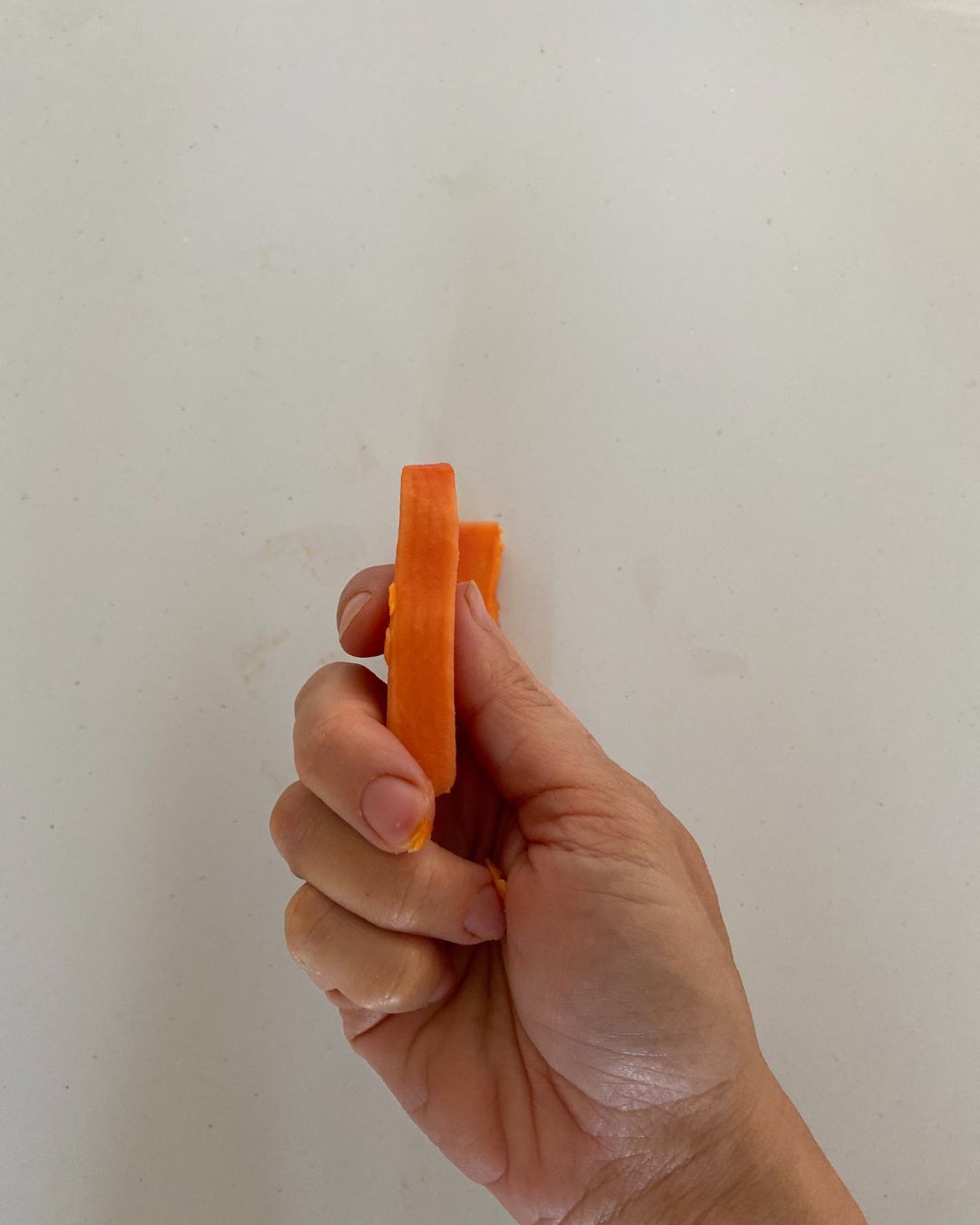 Ofereça fatias largas de papaia (ver fotos) bem madura, sem sementes e sem pele. Embora há quem recomende deixar a casca para evitar que a papaia escorregue, eu recomendo sempre retirar a casca. Se a papaia escorregar, experimente "panar" as fatias com farelo de trigo ou aveia, ou coco ralado.