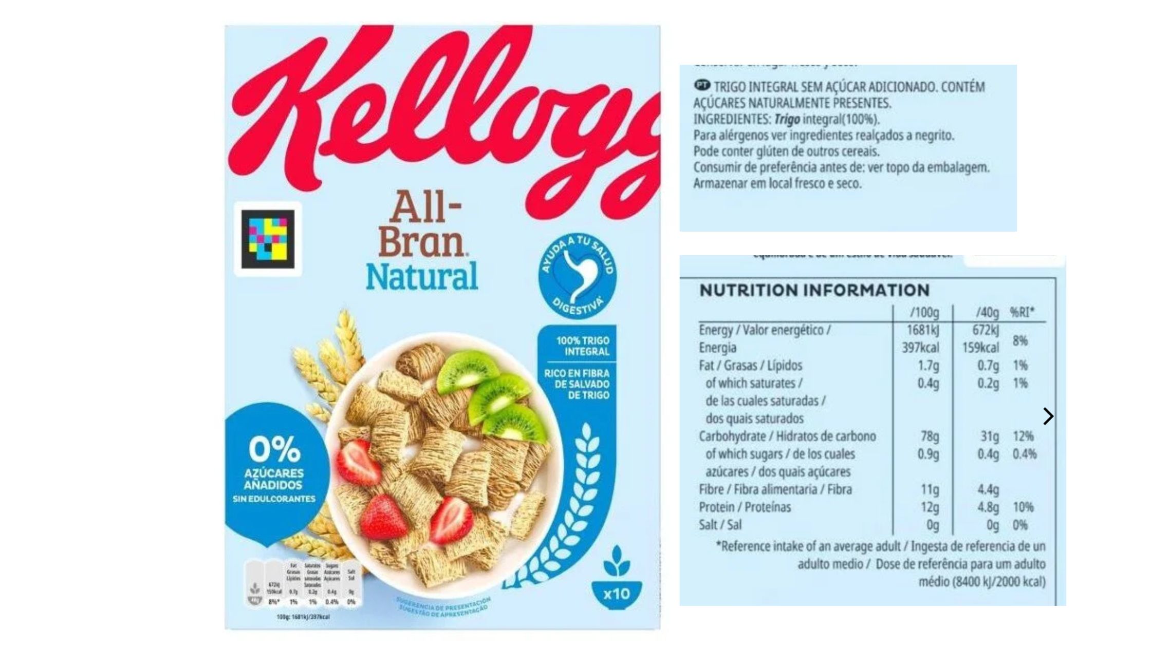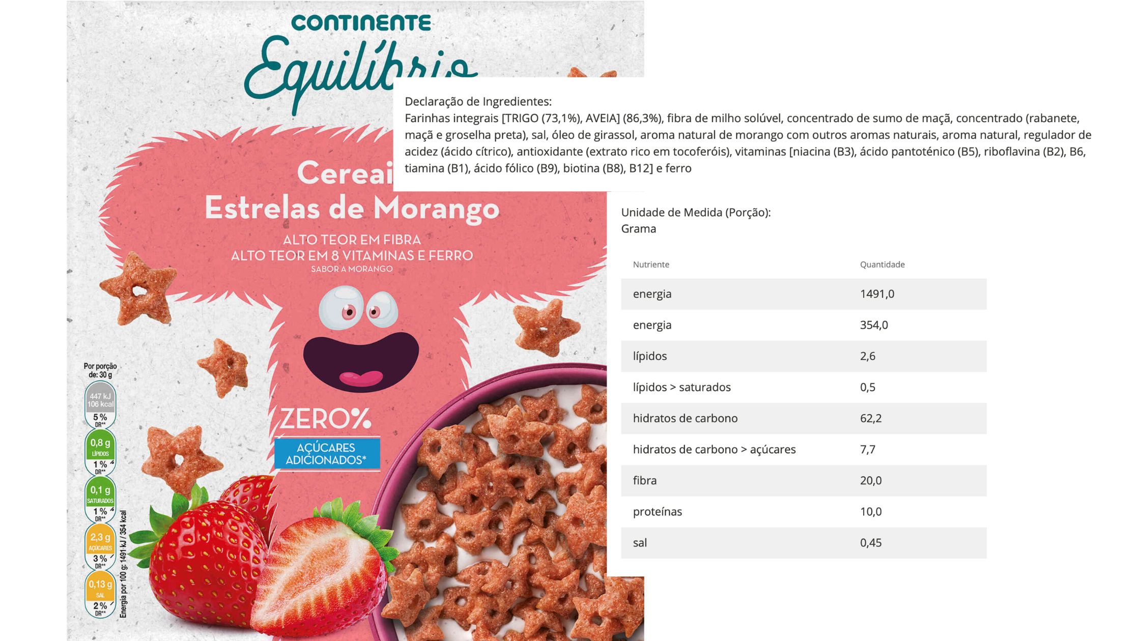 Não me agradam os aromas na lista de ingredientes. No entanto, são cereais enriquecidos com cálcio e, embora tenha açúcar adicionado (sumo concentrado), tem uma quantidade média-baixa de açúcar (7,7g).