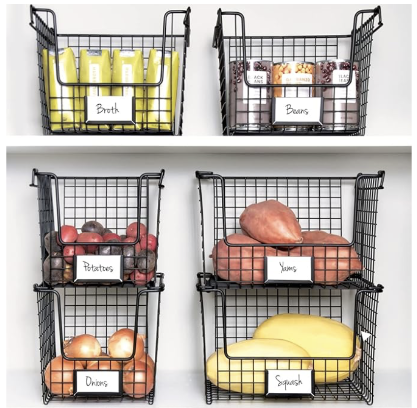 Cestos ou caixas: Ótimos para agrupar itens da mesma categoria. Gosto de ter uma caixa para massas, outra para leguminosas, etc. Os cestos empilháveis da iDesign são ótimas!