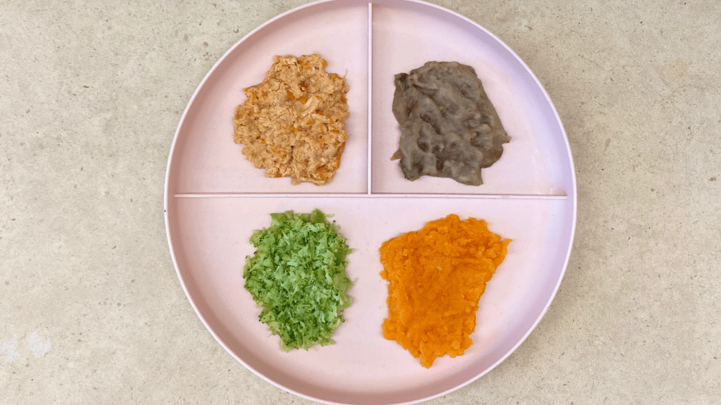 Na foto abaixo mostramos um exemplo: frango desfiado e picado com tomate, feijão cozido e amassado, brócolos no vapor amassados e puré de batata-doce laranja com leite materno.