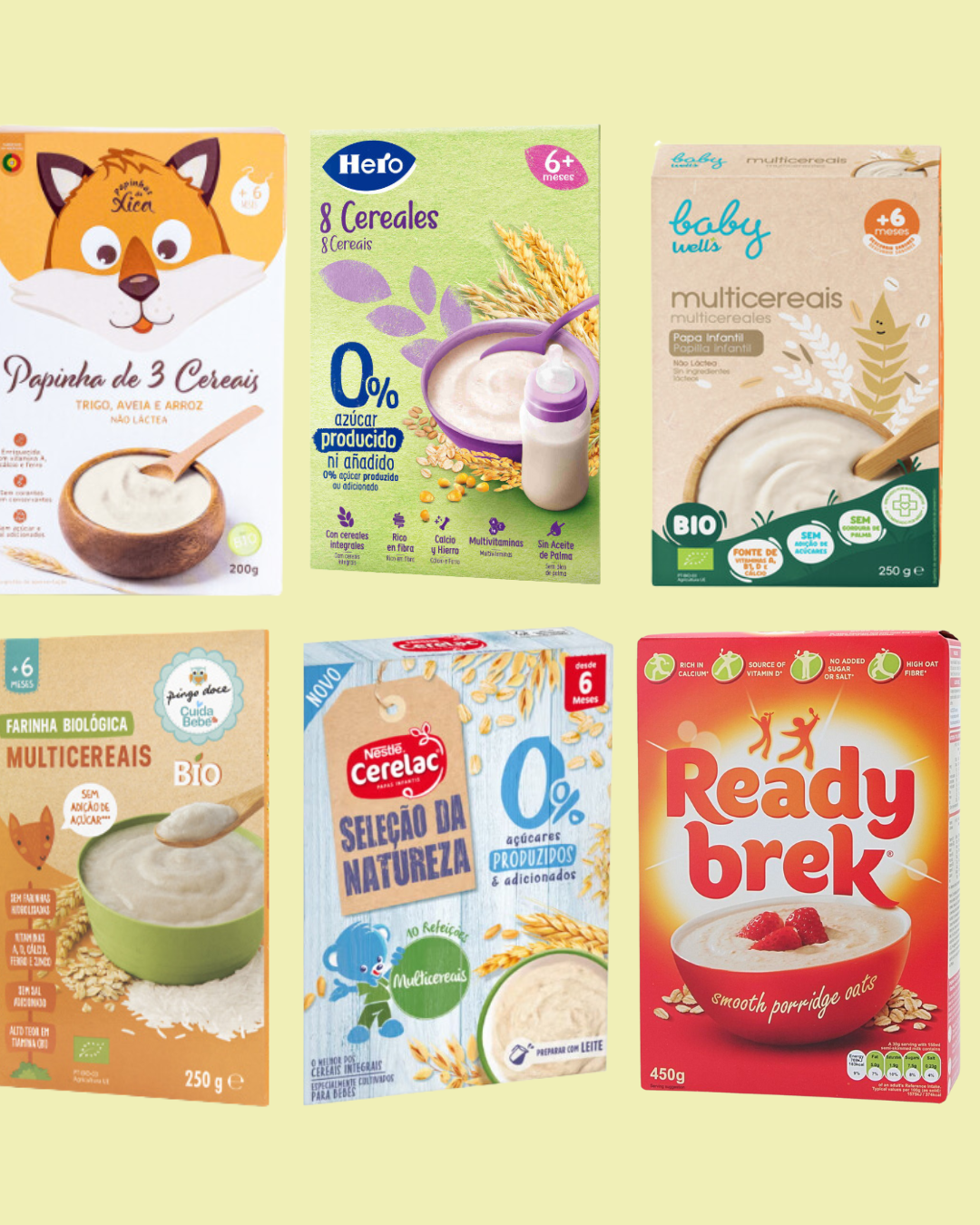 Deixamos aqui algumas sugestões de papas infantis que têm uma lista pequena de ingredientes, contém 5 gramas ou menos de açúcar e menos de 1,5g de gordura saturada. Da esquerda para a direita e começando em cima: