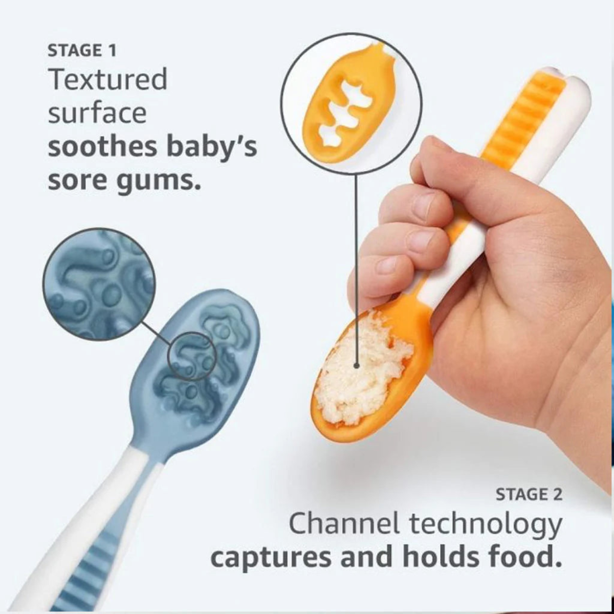 Enquanto com uma colher normal o mais provável é que a papa acabe toda ou quase toda na mesa ou no chão (e algumas vezes na parede!), esta colher tem uma superfície de silicone texturizada que "agarra" as papas e sopas. Além disso, tem uma pega larga com orifícios para que seja mais fácil para aos mãos pequeninas dos bebés segurarem.