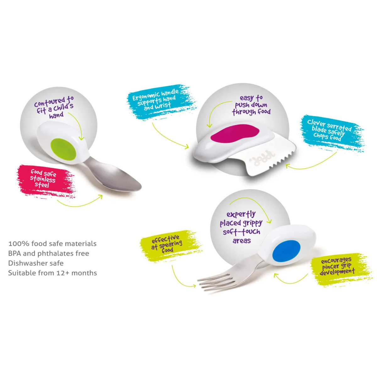 Os talheres da Doddl são pequenos e têm pegas largas, perfeitos para as mãos pequeninas dos bebés. Como a pega é mais larga, também evitam que os bebés levem os talheres muito atrás na boca. Pode comprar o conjunto completo com gargo, faca e colher ou apenas o garfo e a colher.