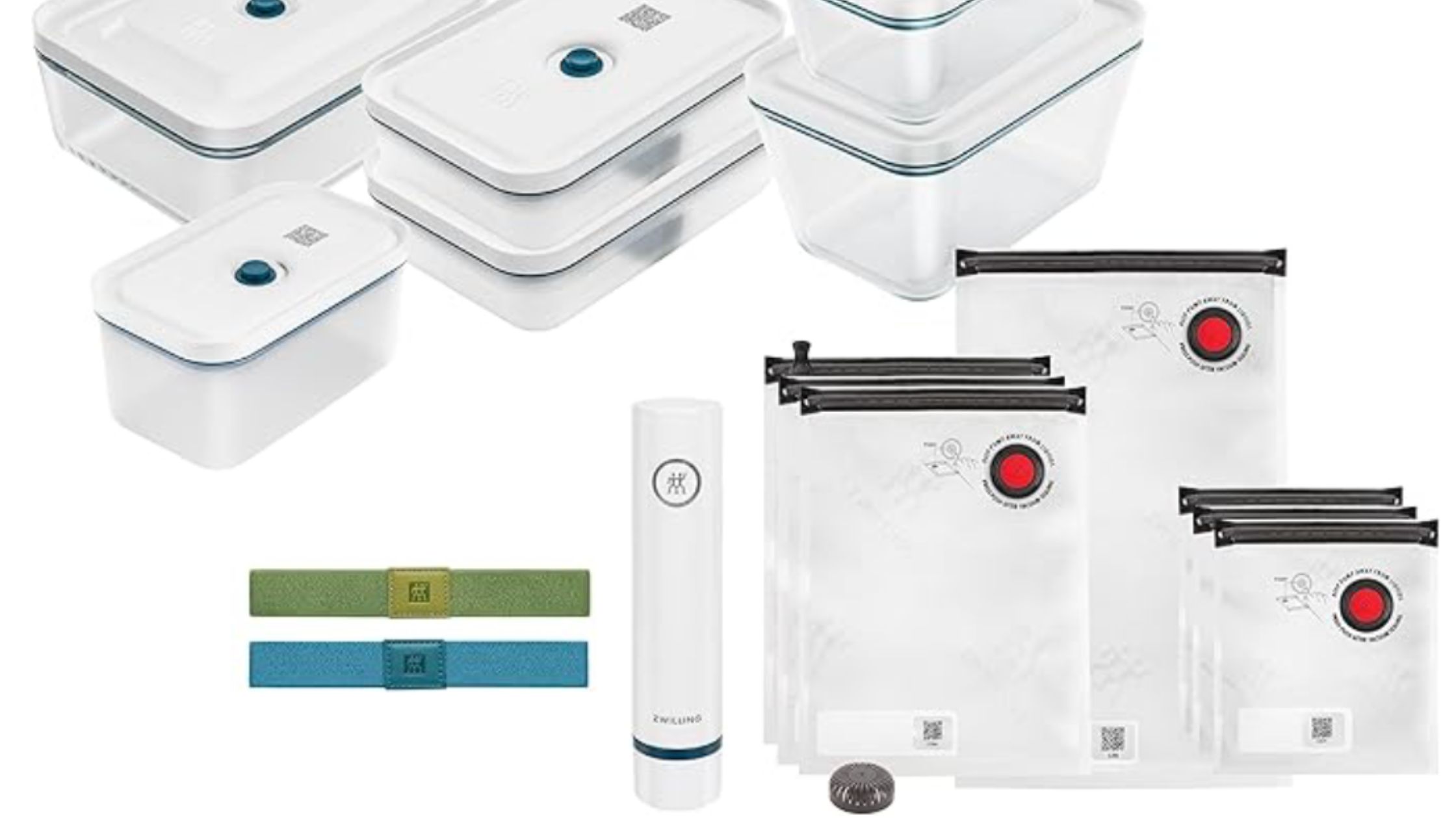 Para maximizar a frescura dos alimentos, especialmente carnes, peixes e vegetais, os recipientes a vácuo, como os da Zwilling, são uma excelente opção. Uso os de vidro para o frigorífico e os sacos para o congelador, porque ocupam muito menos espaço. Eles: