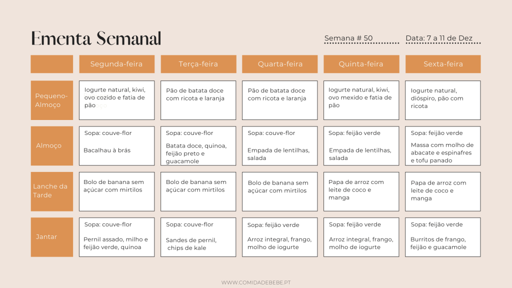 Esta ementa é a ementa de toda a família cá em casa. Um bebé de 1 ano normalmente já pode (e deve!) comer a mesma comida que toda a família e por isso estas ementas são aptas para bebés a partir dessa idade. Lembrando que a ideia destas ementas é servirem de inspiração. Pode sempre adaptar à vossa família.