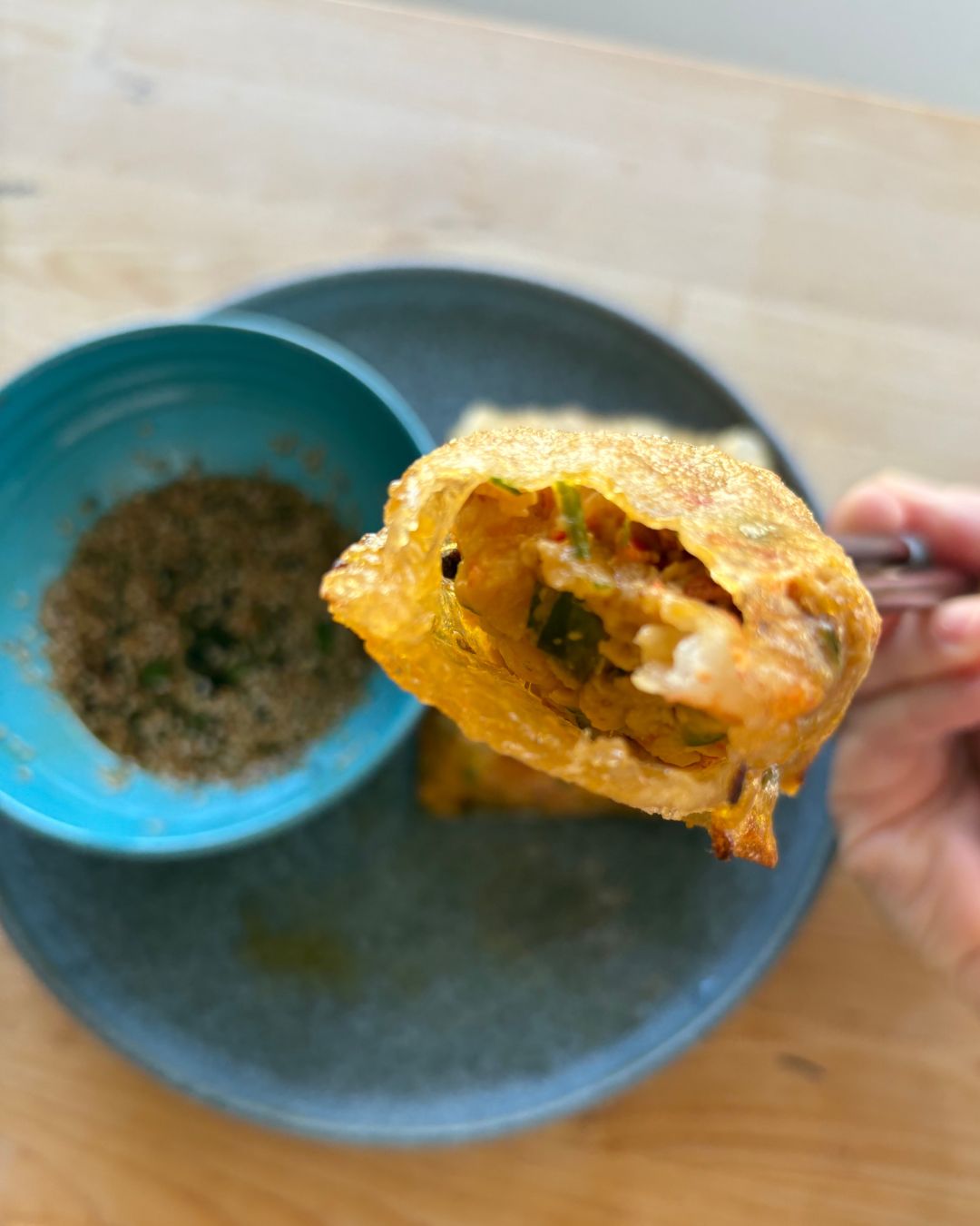 Acompanha com molho de soja misturado com metade da quantidade de vinagre de arroz, cebolinho picado e sementes de sésamo.