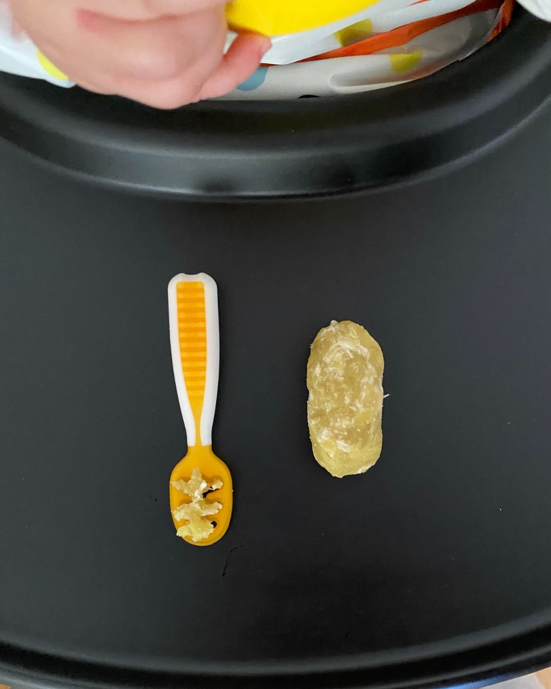 Esta é uma refeição que pode ser toda dada em BLW, em puré ou algo no meio. Podem oferecer uma tira de batata com tira de frango, puré de batata com frango desfiado ou por exemplo puré de batata com tira de frango. Eu amassei a batata, misturei com frango desfiado e picado e um pouco de caldo do cozimento e ofereci uma parte no prato e fiz um croquete com a outra.